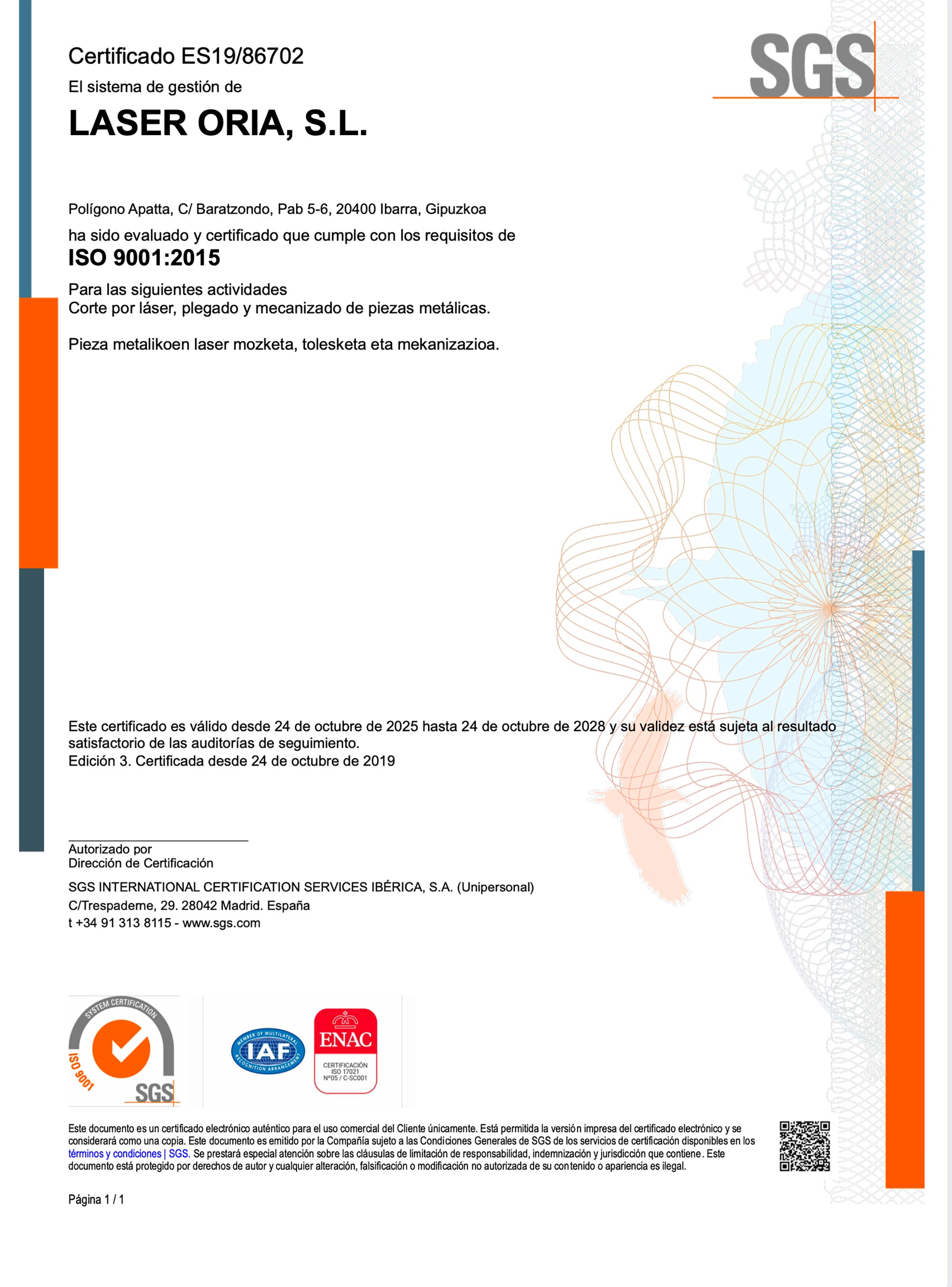 - Horregatik guztiagatik, kalitate-sistema bat dokumentatu eta ezarri dugu, etengabeko hobekuntzara bideratutako UNE-EN-ISO 9001 arauaren eskakizunekin bat etorriz, eta LASER COWIS osatzen dugun pertsona guzti-guztiek ezagutzen, ulertzen eta aplikatzen dute.